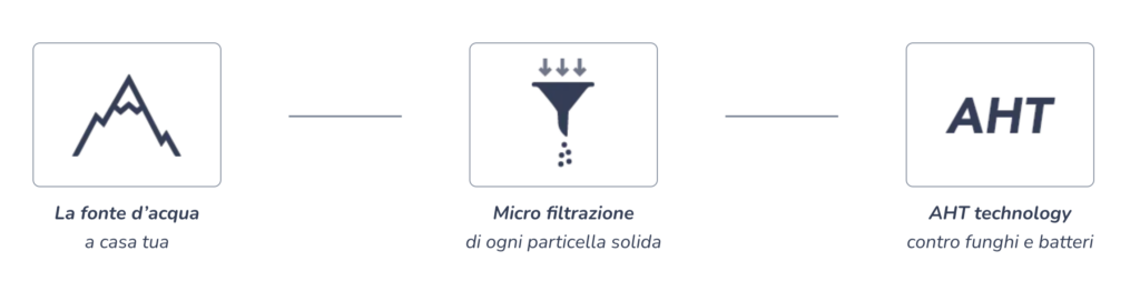 Un sistema di microfiltrazione per acqua naturale a temperatura ambiente, installabile sotto il top della cucina. Dispone di un doppio filtro: uno a carboni attivi per particelle fino a 5 micron e uno a carbone argentizzato batteriostatico per particelle fino a 0,5 micron.